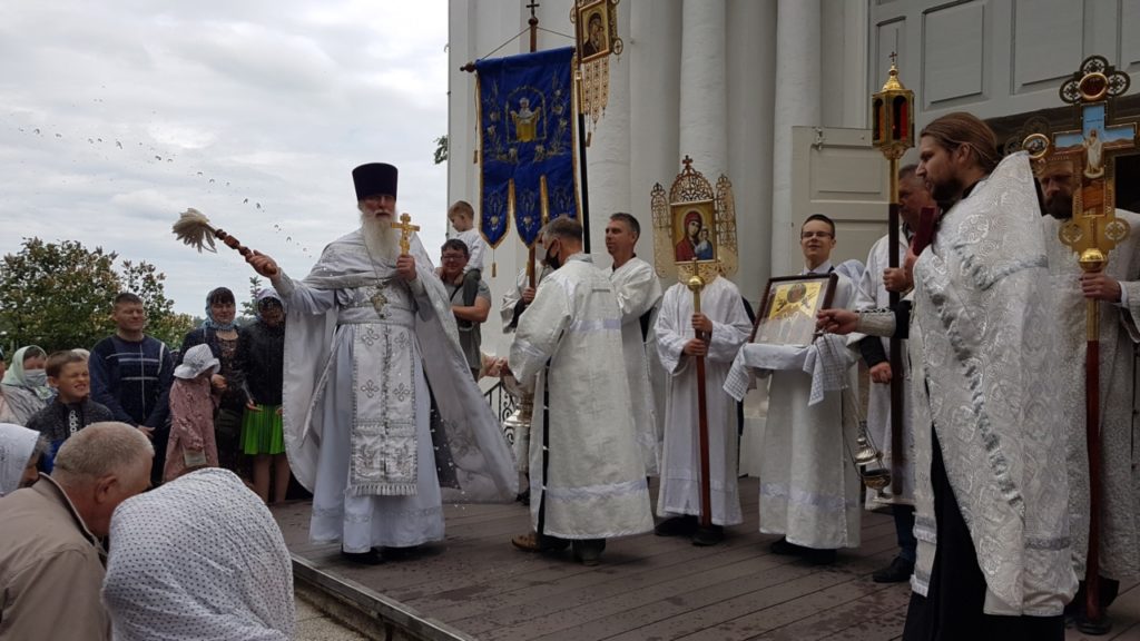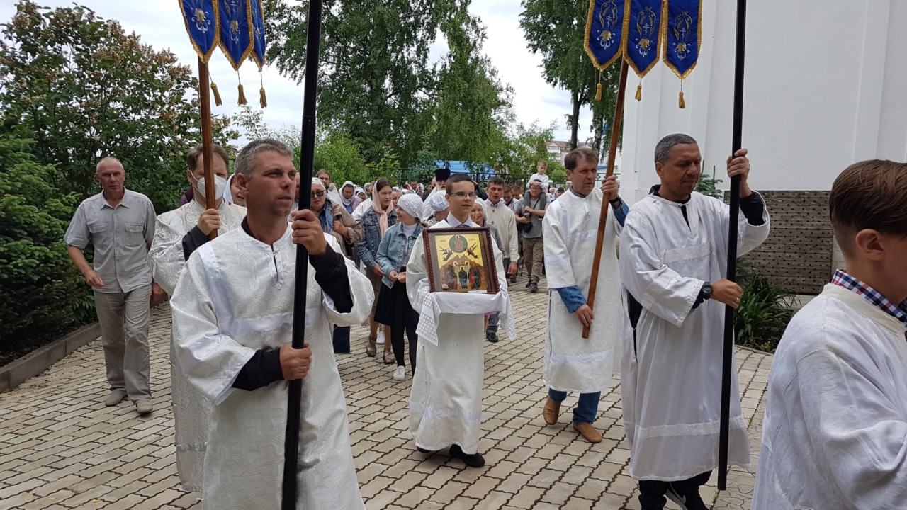 И был крестный ход — торжественно, под колокольный звон вокруг белого воздушного храма под синим чистым небом, под окропляющей нас святой водой.