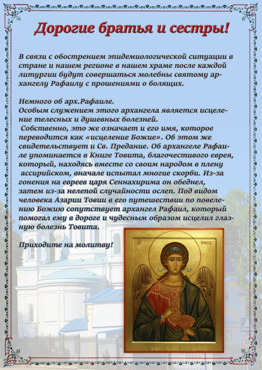 Небе́сных во́инств Архистрати́зи,/ мо́лим вас при́сно мы недосто́йнии,/ да ва́шими моли́твами оградите́ нас/ кро́вом крил невеще́ственныя ва́шея сла́вы,/ сохраня́юще ны пpипа́дающия приле́жно и вопию́щия:/ от бед изба́вите ны,// я́ко чинонача́льницы вы́шних Сил.