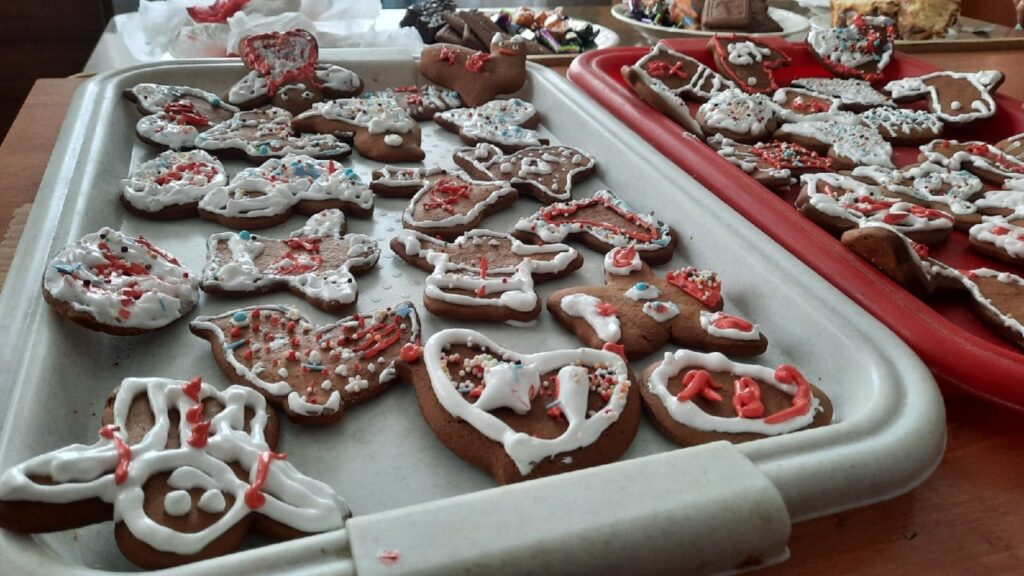 Все вместе потрудились во время мастер-класса. Надо было раскрасить разноцветной глазурью заранее испечённые пряники, а пока они сохли, все радостные и довольные приступили к чаепитию. В завершении Лиза Ипполитова исполнила на аккордеоне мелодии военных лет.