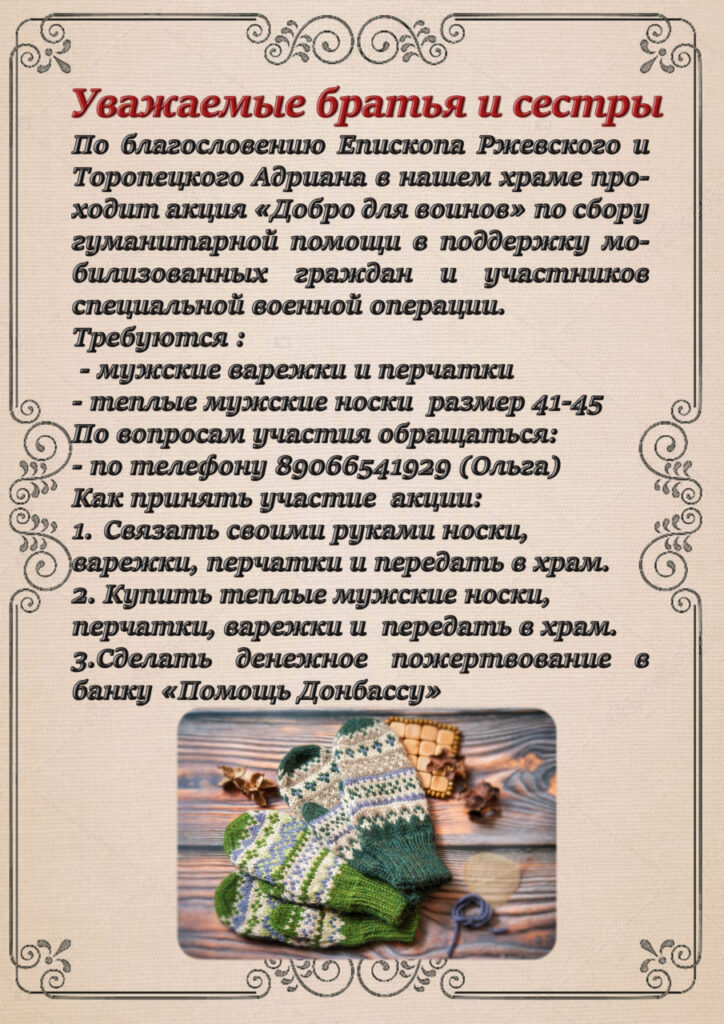 Главная страница Новости в нашем храме проходит акция «Добро для воинов » по сбору гуманитарной помощи в поддержку мобилизованных граждан и участников специальной военной операции. объявление о варежка и носках для мобилизованных