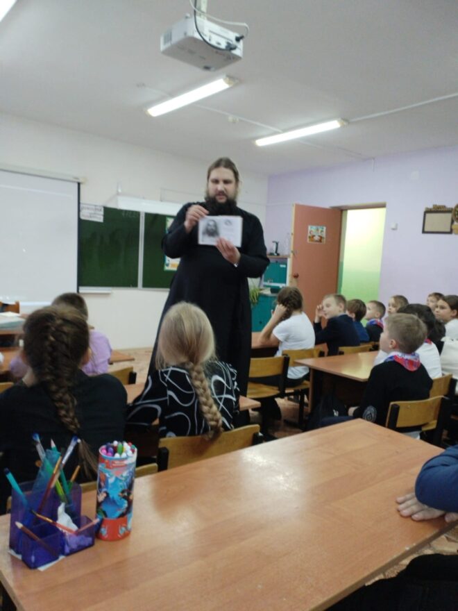 4 декабря 2025 года состоялась беседа в школе д. Глебово с клириком Вознесенского собора иер. Сергием Ефимовым о московских святых Алексее и Сергие Мечевых.